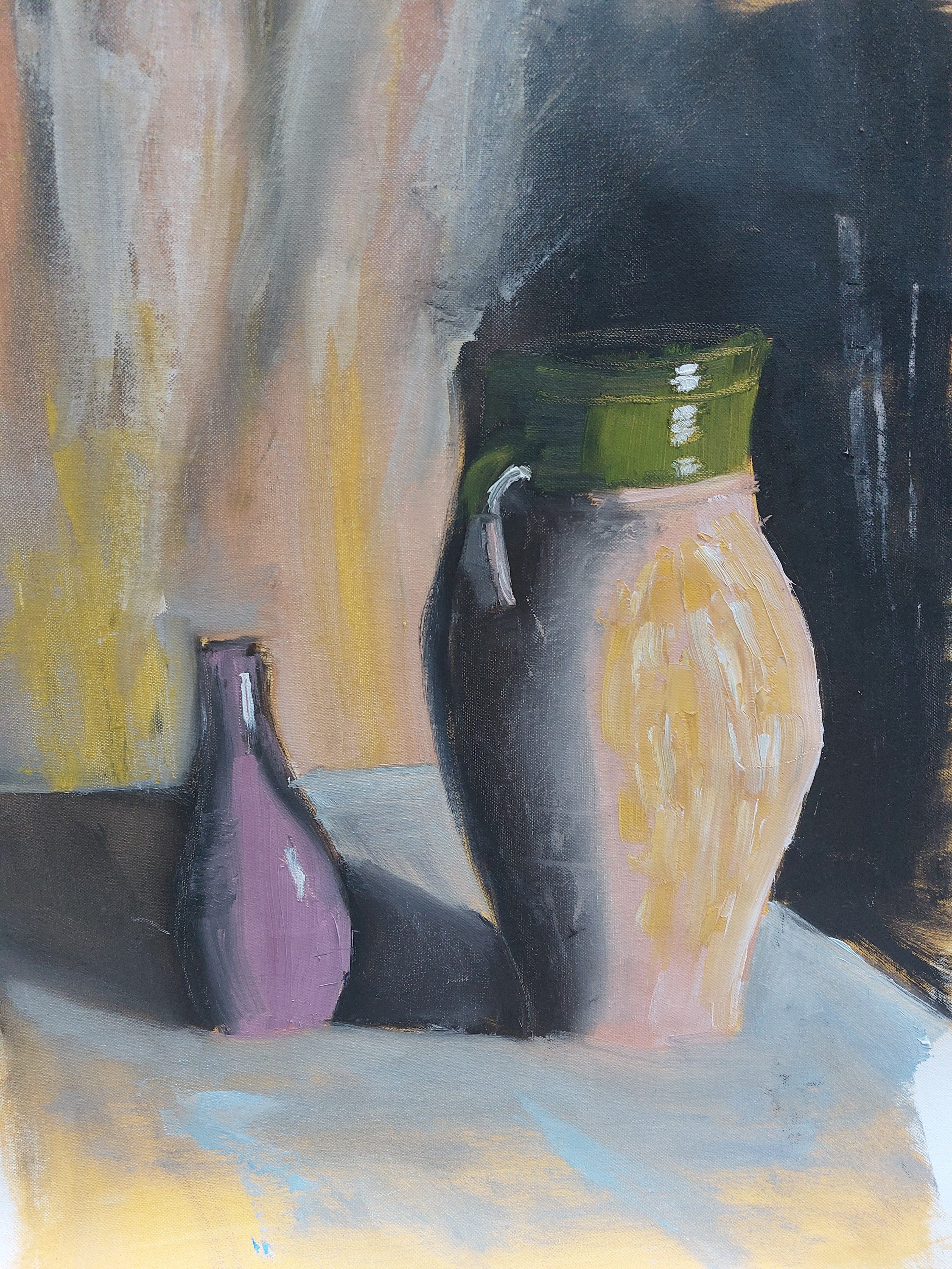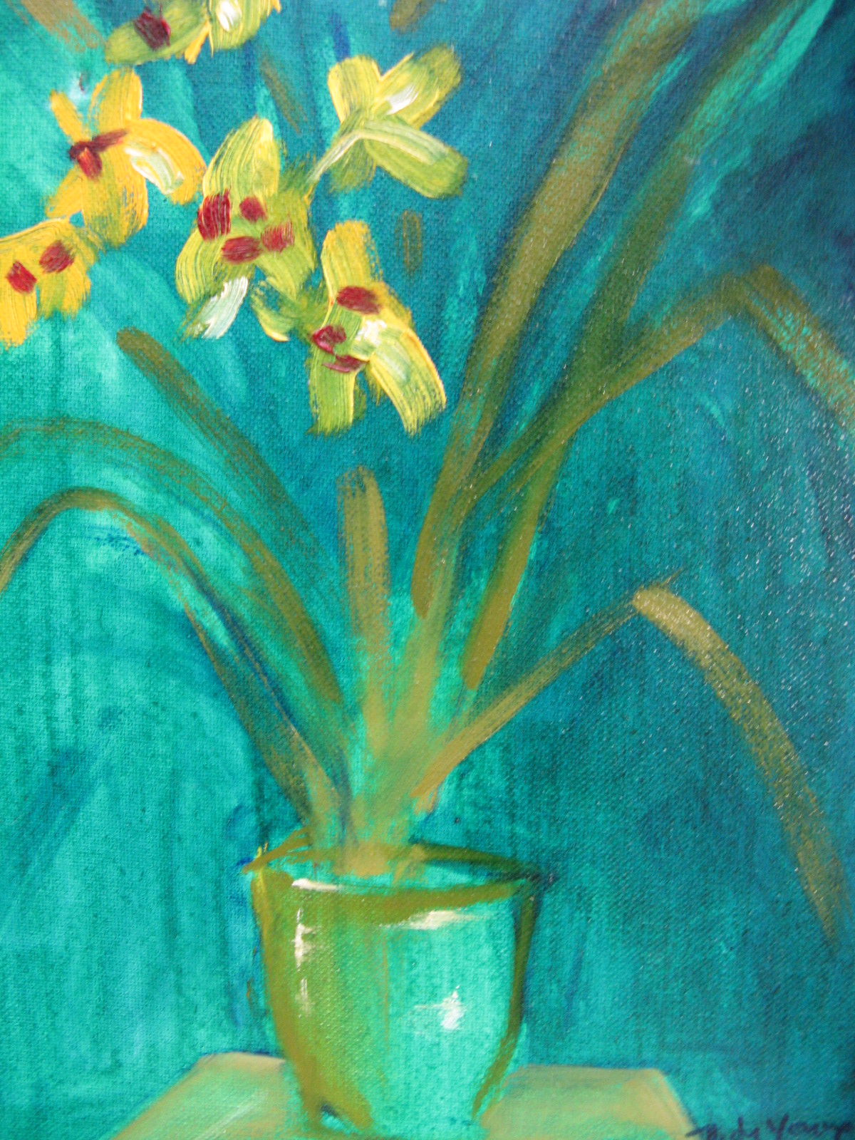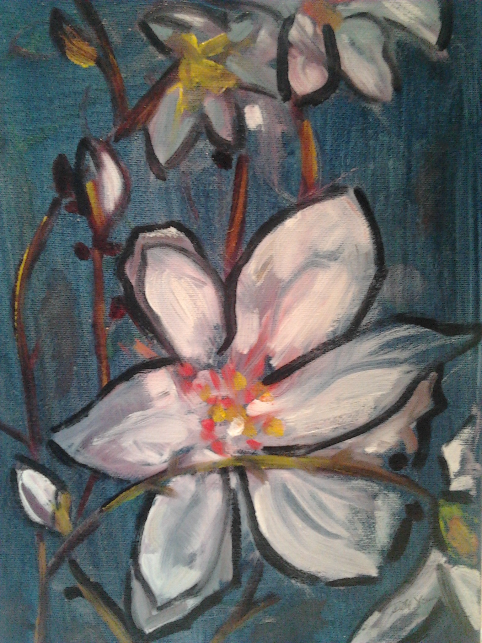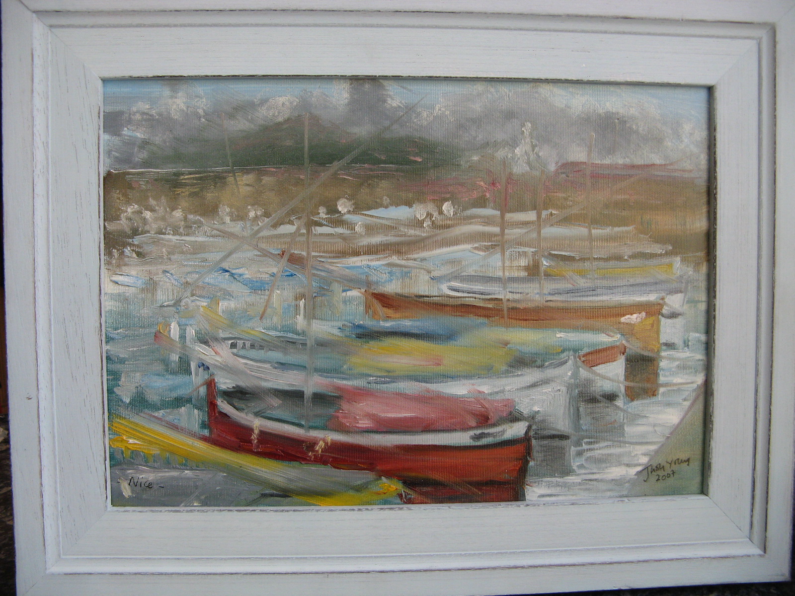 Oils / Mixed Media White Flowers on Blue, Unframed, £200 Cherry Trees, Battersea Park - Water Colour and Guache, Framed - SOLD Daffodils, oils on canvas, unframed £150 Aliums, oils on canvas, unframed - SOLD Portrait - oil on canvass unframed - NOT FOR SALE Racing at Cagnes-sur-Mer - Oil on canvas framed - £600 Boats in Nice - Oil on Paper framed - SOLD
